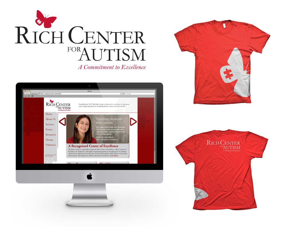 Myself, two other designers, and a former design professor teamed up with the Rich Center for Autism in Youngstown, Ohio to create a new identity for the center. We created a new logo with a full identity system that bridged the gap between the center's academic research areas with the childlike playfulness of the center's original logo of two children chasing a butterfly. To accompany the identity we included multiple design concepts for marketing and promotional items using that new identity to inspire the board members.
